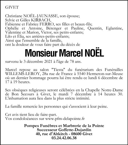 Décédé à Mesnil-Saint-Blaise (5560) le vendredi 3 décembre 2021 à l'âge de 78 ans