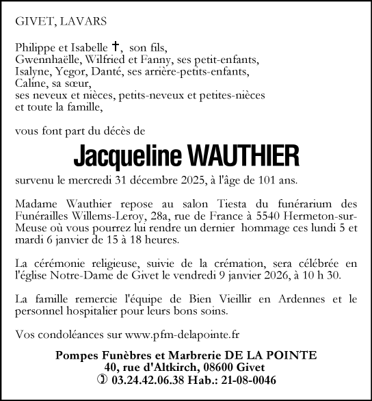 Décédée à Dinant (5500) le mercredi 31 décembre 2025 à l'âge de 101 ans
