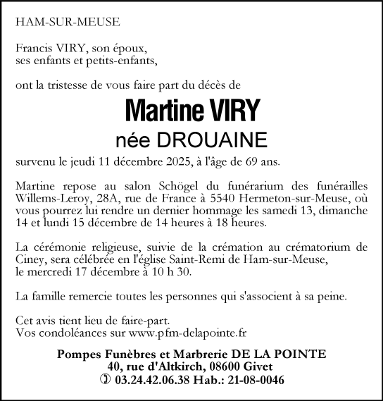 Décédée à Yvoir (5530) le jeudi 11 décembre 2025 à l'âge de 69 ans