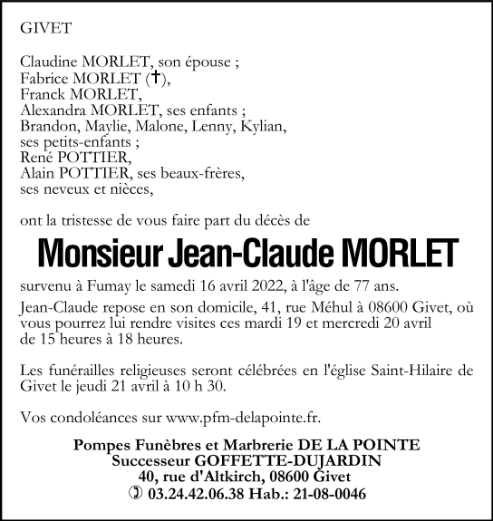 Décédé à Fumay (08170, France) le samedi 16 avril 2022 à l'âge de 77 ans